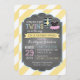 Yellow and white stripe print background with polka-dot jumper tutu and stripe jumper with tie on clothesline twin boy and girl baby shower invitation card.