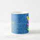 Colourful tie-dye icon from the 1960s peace movement on a background of blue denim. The two-fingered salute represents a preference for peaceful solutions over the alternatives. Psychedelic tie-died fabric may be retro now, but in the 60s it was a hippie fashion statement. The text on the mug says "Peace," but you can customise with your own name or saying and change the font style, size and colour.