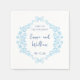 Add a sweet touch to your special event with these elegant custom wedding napkins, featuring a delicate bow and floral wreath design in timeless blue. Perfect for weddings, engagement parties, and rehearsal dinners. Customise with your names and date to add a personal touch that guests will love. The soft blue hues and intricate details of this design blend classic romance with modern elegance, making it a chic addition to your wedding decor. Whether for cocktail hour or reception, these napkins add a touch of refined charm to your celebration.