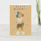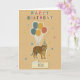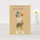 This folded greeting card features a cheerful tiger in a party hat with colourful balloons and scattered stars. Add the birthday child's name to the label for a fun personal touch – just like "Noah"!