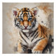 A Tiger cub with detailed watercolor with expressive eyes is portrayed against a soft, blurred background. The natural colours enhance the lifelike appearance.