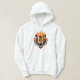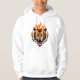 Stylised tiger's head, depicted in bold colours and a dynamic design. The tiger has striking orange and black stripes, with intense yellow eyes that convey a fierce expression. Surrounding the tiger's head are flames in vibrant shades of yellow and orange, which enhance the sense of power and energy. The overall composition is aggressive and energetic, with a focus on the tiger's sharp teeth and powerful features, suggesting a theme of strength and ferocity.