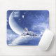 White tiger lies on a crescent moon over reflecting water with stardust and pixies or fairies around blue shaded fantasy mouse pad