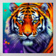 Vibrant and striking depiction of a tiger, chraacterised by its richly coloured fur, predominantly orange with bold black stripes. The tiger's face is front and centre, showcasing its intense yellow-green eyes that draw the viewer in. The background consists of a colourful gradient, blending shades of turquoise and purple, along with abstract splashes of colour that enhance the overall visual impact. The detailed fur texture and expressive features of the tiger contribute to a dynamic and engaging portrayal of this majestic animal.