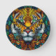 Vibrant, stylised depiction of a tiger's face, chraacterised by its striking orange and black fur patterns. The eyes of the tiger are a vivid green, adding to the intensity of its expression. Surrounding the tiger's face is a rich tapestry of colourful foliage and flowers, integrating shades of deep greens, blues, and warm oranges. The overall composition merges the natural beauty of the tiger with intricate botanical elements, creating a visually stunning and harmonious piece of art. The use of bold colours and detailed textures enhances the dynamic and enchanting quality of the image.