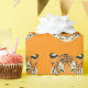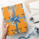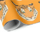 Wrapping paper is shown with a cute tiger print on an orange background.