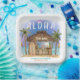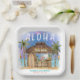 Tiki party birthday paper plates feature a watercolor Tiki bar on the beach at night under the moon and stars with palm trees, string lights, Tiki torches and a Hawaiian "Aloha" greeting. Tropical cocktails, a pineapple, hibiscus and palm leaves, a surfboard and a parrot in a pirate hat decorate the bar area. Art by KL Stock