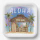 Tiki theme square paper plates feature a watercolor Tiki bar on the beach under the moon and stars with palm trees, string lights, Tiki torches and an "Aloha" greeting. Tropical cocktails, a pineapple, hibiscus and palm leaves, a surfboard and a parrot in a pirate hat decorate the bar area.. Perfect for couples shower, wedding reception, engagement party and anniversary celebrations. Art by KL Stock