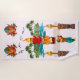Pele, the Fire Goddess, surrounded by tikis, is featured on this bright, colourful beach towel.