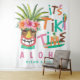 Tropical Tiki theme backdrop tapestry features a hand painted Tiki totem, pineapple, surfboard and parrot with "It's Tiki Time" typography. The "aloha" greeting and names (or whatever text you like that can fit in that space!) can be personalised. Perfect for a wedding reception, couples shower, luau, birthday, anniversary and any island themed celebrations. Art by KL Stock