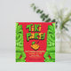 Tiki Party Surprise birthday party invitation in bright green and yellow with red background.