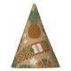 Tiki theme party hat features a pattern of Tiki totems, pineapples, hibiscus flowers, palm and monstera leaves. Perfect for tropical, luau and beach theme parties.