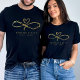 Elegant black and gold wedding honeymoon t-shirt with text Til Death do us Part in infinity symbol with heart. Personalise it with your wedding details.