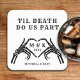 White and black til death do us part wedding coasters with skeleton heart hand and name monogram. Personalise it with your event details. Great for a gothic or Halloween wedding / bridal shower / bachelorette party.