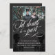 Elegant dark Halloween or goth wedding save the date with Til death do us part written in a swirly white calligraphy script. Add your wedding information in white against a dark grey background with black skeletons and personalise with a photo!