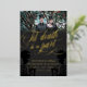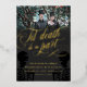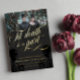 Elegant dark Halloween or goth wedding save the date with Til death do us part written in a swirly gold foil calligraphy script. Add your wedding information in gold against a dark grey background with black skeletons and personalise with a photo!
