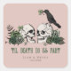 These elegant gothic "Til Death Do Us Part" Irish St. Patrick's Day wedding square stickers feature hand-drawn Irish & gothic themed illustrations in black ink, showcasing husband and wife skulls and a black crow adorned with green roses, leaves, berries, wildflowers and green clovers. Elegant blush pink background. Personalise with your wedding details. All text is editable.