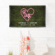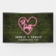 Pink neon sign inspired "Til Death" heart design over boxwood inspired background with custom white text for bride and groom's names and wedding date.