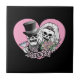 Bride and groom skulls are dressed in their wedding finest with JUST MARRIED text.