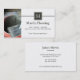 This construction flooring business card has a photograph on the left side of an orange bucket filled with grey mortar and a trowel on the edge of the bucket. In the background, you can see some tile that is being laid. On the right, there is a pewter grey square at the top with two stripes behind. There, you can easily customise the monogram initial. Below and on the backside, you can personalise all of the details of the business.