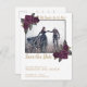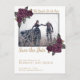 Darkly beautiful Save the Date card with Till Death Do Us Part saying, dark purplish roses, and gold text. Distressed script typography adds to the look. Personalise with your own photo and wedding details. See coordinating items in our shop, Enchanted Finch.