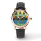 The perfect square face of this watch displays a painted detail of an 1896 Aesthetic Movement wood mantle clock designed by Charles Francis Annesley Voysey, in a beautiful craftsman style colour palette. The image reads: "Time and tide wait for no man." .
