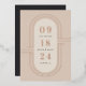 A simple and elegant save the date design with art deco influences, featuring your wedding date, names, and wedding location displayed on an arched central element adorned with rose gold foil line art.