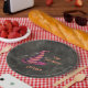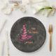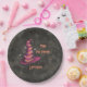A fun round party paper plate with a floating pink and orange enchanted witch hat that says "Time for Treats, Let's Eat" on a dark charcoal black background. All the text is editable. See all my witch-themed Halloween party supplies. Happy Halloween!