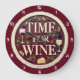 This is a decorative wall clock featuring a deep maroon-red color scheme. The phrase "TIME FOR WINE" is centralized in large, three-dimensional light-colored block letters. The face is adorned with realistic illustrations of a wine bottle, glasses (red and white), clusters of grapes (purple and white), and a cheese wedge. The inner frame has a distressed, aged border. The design may look real due to the high detail and three-dimensional texture in the artwork.