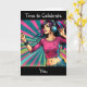 A cute birthday card for a teenager or twenty-something girl. Let's celebrate you! Cute comic book style lady with headphones listening to music with a retro pop art background.