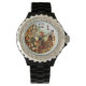 Time To Feed The Chickens Wrist Watch. Chickens and a Rooster feeding at the farm, vintage image.