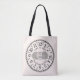 A cute illustrated, time to knit themed tote bag, featuring a ball of yarn. The text reads: time to knit and knit purl repeat. A light pastel peach background. A gift for an avid knitter. A great gift for an avid knitters studio or crafters corner.
