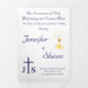 Interior is of a white background with navy-blue border. With explanations of the Mass displayed throughout, this elegant design also includes the name of the wedding officiant, names of altar servers, names of the parents of the bride and parents of the groom, wedding party names including the names for a maid-of-honor and best man, room for up to seven bridesmaids and groomsmen names, plus the names of the flower-girl and ring bearer. In addition, design of back cover features your text, a bible verse (or your message) and a prayer request for the happy couple against a navy background. All text is customizable. Designed to coordinate with the "Timeless Catholic Monogrammed Wedding Suite" collection.