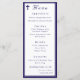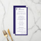 Design front features a white background to the image of a cross in top left corner. Heading is displayed in an elegant font in top center. Following the traditional format for a wedding menu, all text is customizable and displayed in a navy-blue font. Entire design is framed by a navy-blue and white border.