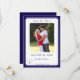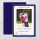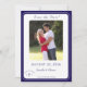 Elegant design features the photo you supply as main image displayed against a white background. Text is featured in a navy-blue font and displayed in the traditional format for a save-the-date card. Your brief message is displayed as an arch over the image of a cross. Initials of bride and groom appear on either side of cross. Entire design is framed with a navy-blue and white border.