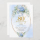 Celebrate a remarkable milestone with this 80th birthday invitation featuring one of today’s most trendy and elegant color combinations: blue and gold. Designed with soft watercolor blue hydrangeas, fresh eucalyptus greenery, and refined gold floral accents, this invitation brings a sense of calm sophistication and joyful celebration to an unforgettable occasion.