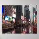 Features an original colour photograph of neon signs on a rainy day in Times Square. Photographed in New York City.