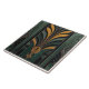 Art Deco style panel with a symmetrical floral design, featuring a central stylised flower in gold and green, flanked by geometric patterns and vertical bars, all set against a dark green background with an aged, textured finish.