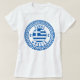 Tinos, Greece women's T-shirt featuring the National Flag Of Greece inside an Ancient Greek pattern circle symbol. Enjoy wearing this T-shirt while you're on vacation on the beautiful Tinos island or give it as a gift souvenir.