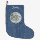 Great Christmas stocking features tinted version of the U.S. Mint's Alaska State 2008 quarter with a bear, fish and the state motto. Blue denim texture background and top text that can be customised with name or monogram.
