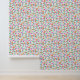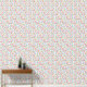 Tiny floral pattern wallpaper. Green stems and leaves with pink and orange flowers on an off-white background.