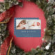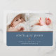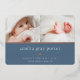 Sweet and elegant birth announcement features two newborn photos aligned side by side, with a band of rose gold foil beneath. Personalise with baby's name, birth stats, and a family message, adorned with a small rose gold foil heart on a dusty blue background.