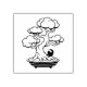 Simple black and white illustration of a Japanese twisted bonsai tree in a shallow tray. Tiny ninja at the roots is gazing up the tree. Bonsai is a Japanese art form using trees grown in containers.
