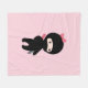 Cute cartoon ninja girl is dressed all in black but for a pink bow on top of her head mask. Traditional Japanese sword katana can be seen attached over her shoulder, it’s handle also coloured pink.