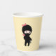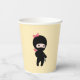 Cute cartoon ninja girl is dressed all in black but for a pink bow on top of her head mask. Traditional Japanese sword katana can be seen attached over her shoulder, it’s handle also coloured pink.