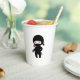 Cute cartoon ninja dressed in black is holding a throwing star. Traditional Japanese sword katana can be seen attached over his shoulder.