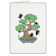 Simple illustration of a Japanese potted bonsai tree in a shallow tray. A group of tiny ninjas made this tree their base. Several ninjas are hiding behind the foliage. One is dangling from a rope tied to a branch, another hovers above the tree strapped to a kite.