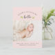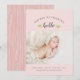 Affordable custom printed baby girl birth announcement photo cards. This sweet simple design has a minimalist typography layout with "hello" calligraphy and green watercolor botanical accents on blush pink background. Personalise the design with baby's name, birthday and birth stats and newborn photo. Reverse side has a coordinating wood grain pattern with space to add additional text and photos. Click Customise It to edit the text fonts and colours and add more photos to create unique one of a kind photo birth announcements for baby girl.