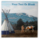 A scene from the Pacific Northwest region of the United States featuring an image of a Native American and his horse near a tipi. Snow has settled on the higher slopes of the mountains in the background. Add your own text.