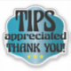Tips appreciated sticker for the service industry. Customers sometimes do not know when it is appropriate to tip, and these stickers placed in your place of business will let them know that tipping is appreciated and remind them to tip. Perfect for any personal service business: waiters and food service, drivers, bartenders, hair stylists, contractors, home repair, manicurist, massage therapist, dog groomer, or tattoo artist. Promote tipping etiquette! Fun font on blue gradient background with 3 stars.
